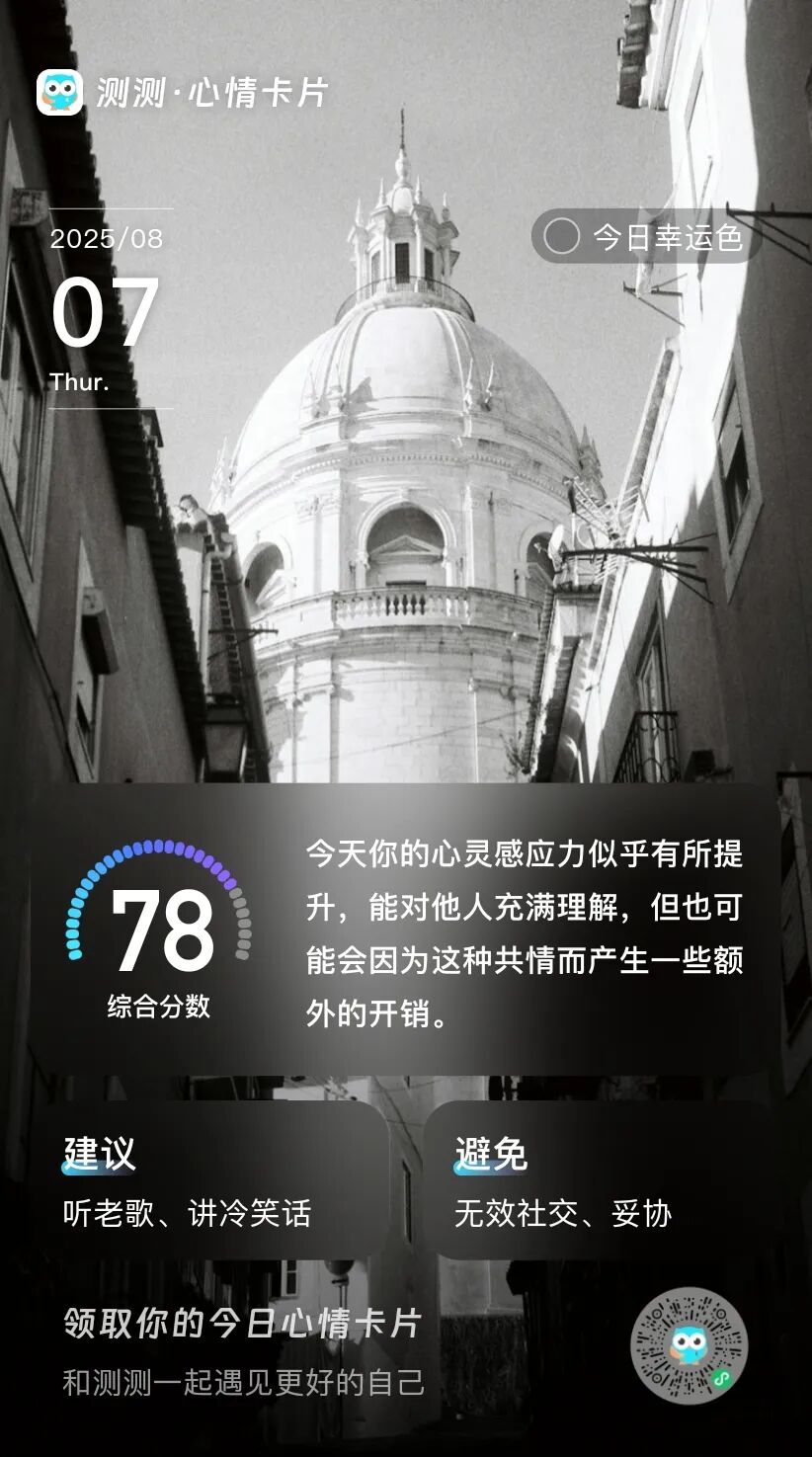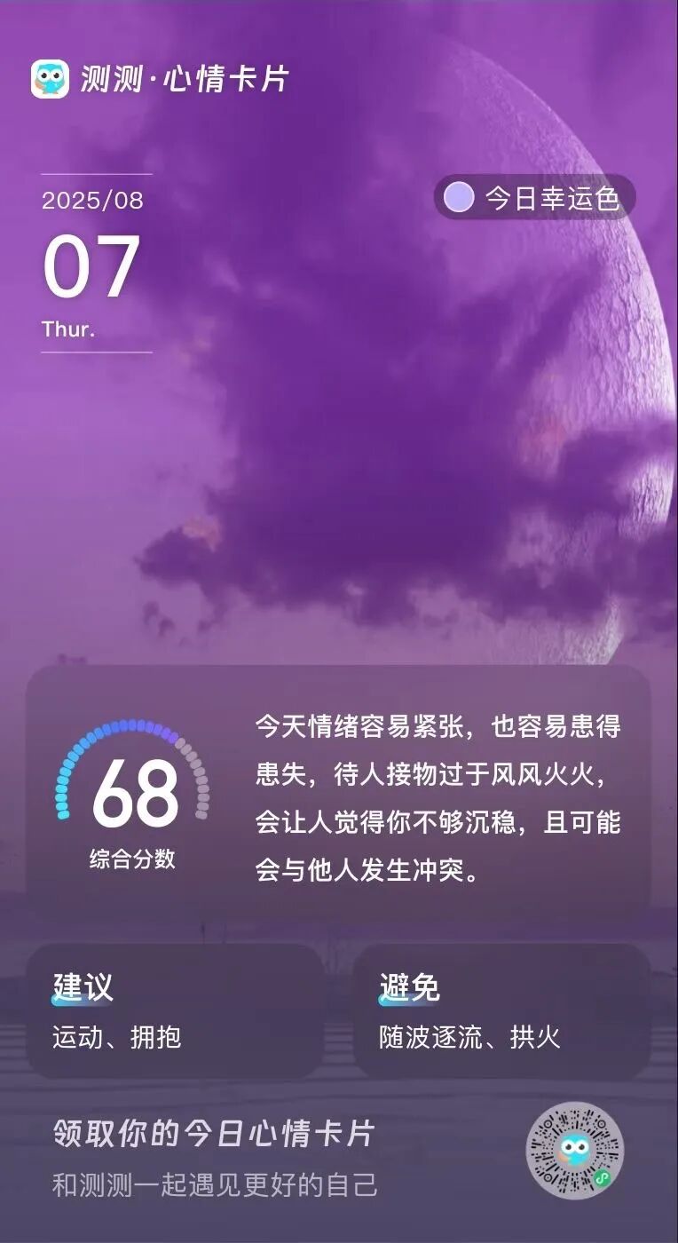 打开测测APP,点击自己的“今日心情”框,点击右上角分享按钮,生成今日“心情卡片”;由幸运颜色生成的背景图片让人在看到卡片的第一秒觉得自己已经开始幸运!