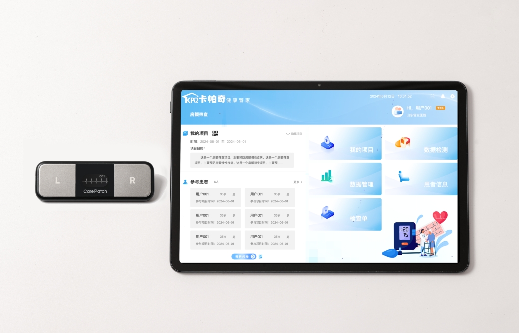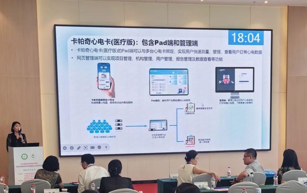 此外,针对医疗机构的便捷管理需求,孟总监介绍了卡帕奇六导联心电卡医疗版,该版本能够通过平板端支持多设备绑定,简化用户测量流程,并辅以功能全面的网页管理平台,实现从项目管理、机构用户管理到报告生成与数据分析的智能化管控,大幅提升了医疗效率。
