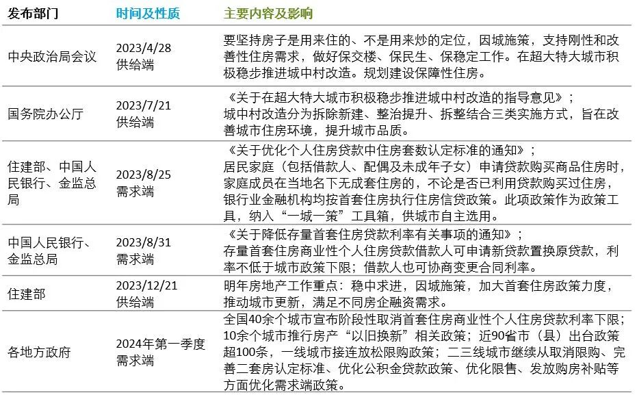 表:2023年及2024年一季度出台的关键房地产政策内容及影响