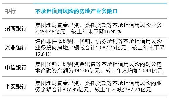 此外,招商银行、兴业银行、中信银行及平安银行四家股份制银行还披露了集团理财资金出资、委托贷款、合作机构管理代销信托及基金等不承担信用风险的业务投向房地产领域的贷款敞口,业务规模相对较小,风险可控。具体数据详见下表:
