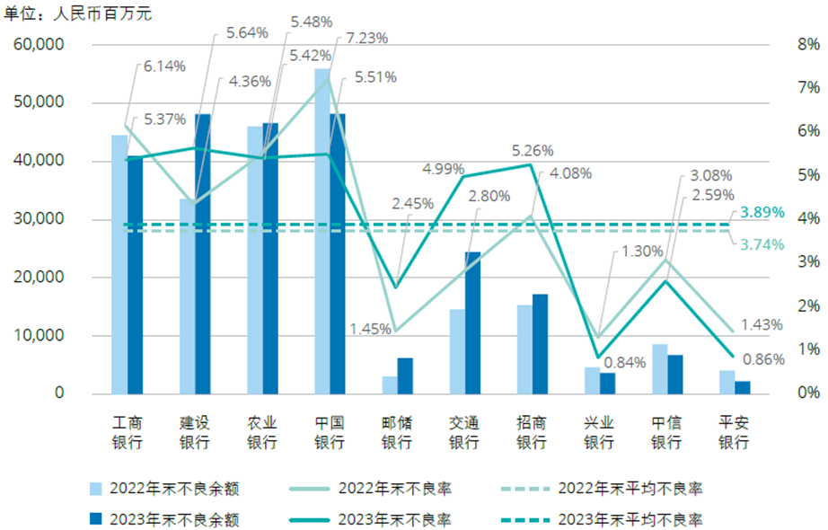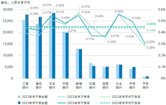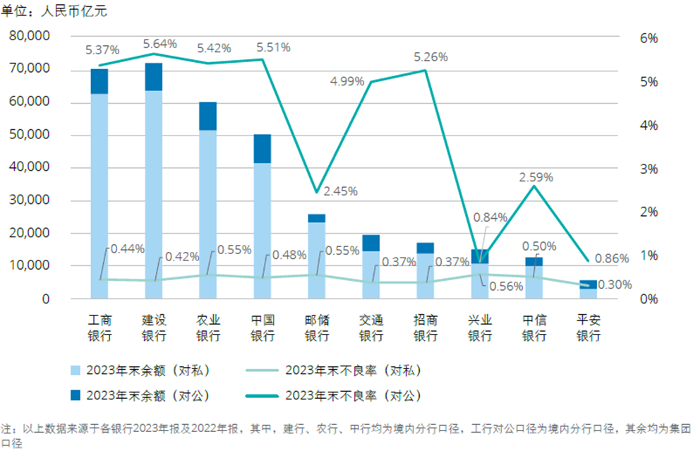 商业银行一般均会主动披露其需要承担信用风险的房地产业贷款和个人住房按揭贷款业务情况,截至2023年末房地产业和住房按揭贷款余额及不良分析如下: