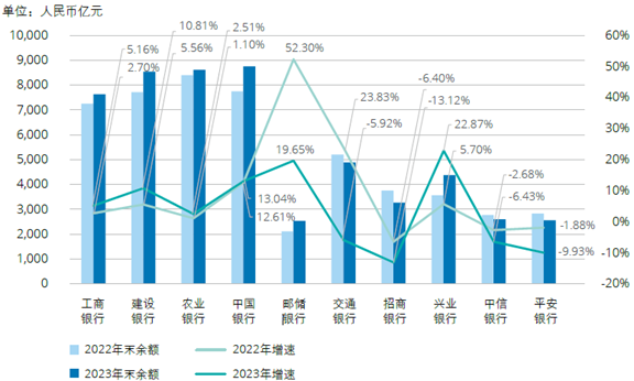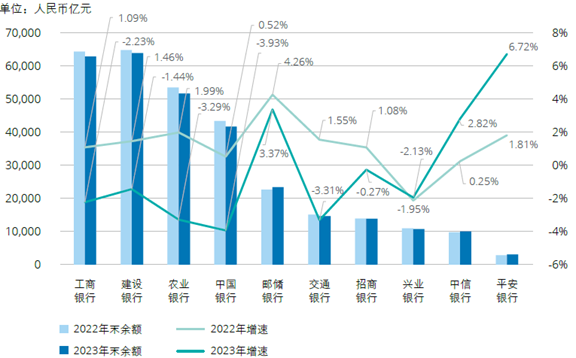 建设银行依然是个人住房按揭贷款规模最大的银行,同比下降1.44%。农业银行规模缩水最多,减少1,758亿元。股份制银行中,仅平安银行和中信银行保持正增长,兴业银行和招商银行个贷规模分别下跌1.95%和0.27%。2023年经济形势不佳、就业市场疲软等因素导致人们对购房的信心下降,从而减少了对按揭贷款的需求,零售增长疲弱。