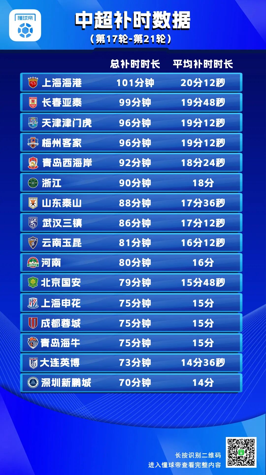 整体来看,中超16支球队在这5轮中,都经历了总共超过70分钟的补时。其中,上海海港5轮总补时时长达到了101分钟,场均补时20分12秒,是16支中超球队中的“补时之最”。深圳新鹏城经历的总补时时长最少,但也达到了70分钟,场均14分钟。