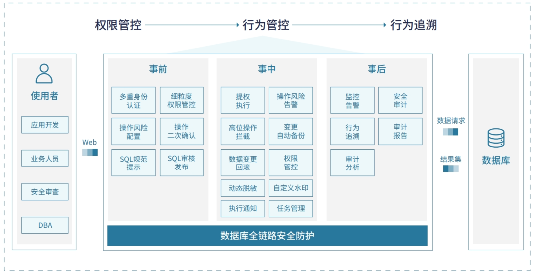平台针对SQL执行的全流程构建了安全机制,全面覆盖日常数据库管控中的事前、事中和事后的操作安全风险。