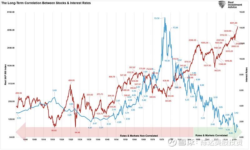 美国股市长期发展的图,拉长到一个世纪的维度,可以看到这种利率与股市的负相关,大体上是很清楚的。
