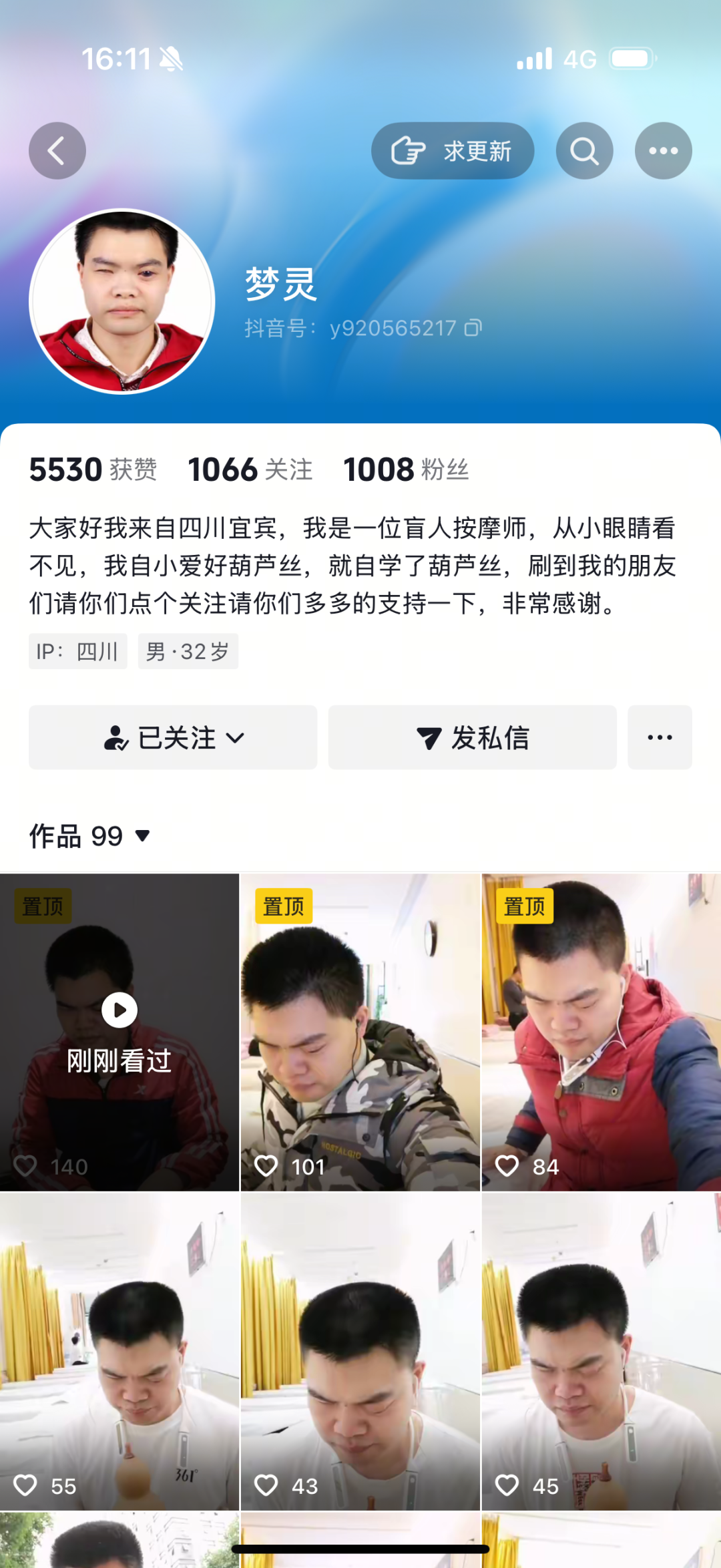 截至目前,他已累计发布99篇演奏作品。这些作品宛如一颗颗璀璨的星辰,在抖音的舞台上熠熠生辉,获赞无数。他的账号也因此吸引了众多音乐爱好者的关注,粉丝数量超过一千人,累计获得五千多个点赞。这一串串数字,不仅是对他音乐才华的肯定,更是他在音乐道路上持续前行的动力。