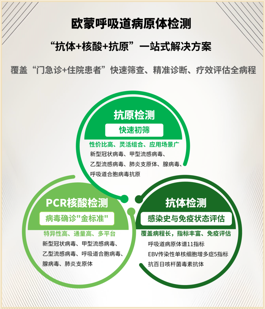欧蒙医学诊断通过升级与完善呼吸道病原体全方法学平台,致力于为各级医疗机构提供“全面精准、灵活适配、高效覆盖”的解决方案,共同提升呼吸道疾病的诊疗水平,为保护公众健康、应对呼吸道传染病挑战贡献专业力量!