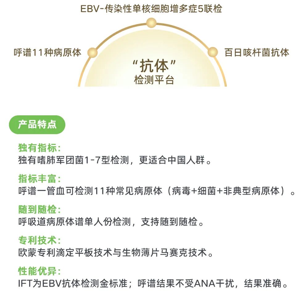 “抗体”检测平台,延续欧蒙抗体检测核心优势,指标丰富,涵盖常见病毒、细菌、非典型病原体等11种病原体,以及EBV、百日咳杆菌等病原体,可以更好地适用于病情反复、恢复期评价或用药疗效不佳的住院患者,为临床评估感染阶段、监测病程动态和指导治疗决策提供重要依据。