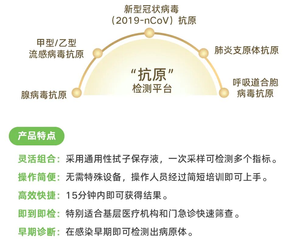 “抗原”检测平台,可检测临床常见病原体6项指标,操作简单,结果快速直观,可广泛适用于各级医院门急诊、发热门诊以及居家自检等快速筛查场景。