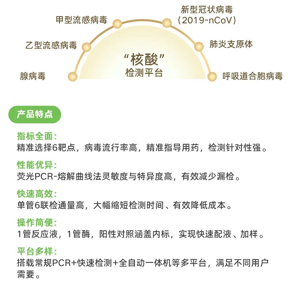 “核酸”检测平台,单管试剂可实现常见病原体6项联检,通量高、时间短、操作简便、有效降低成本,方法学特异性强,可搭载常规PCR、快速检测、全自动一体机等自动化设备,实现对呼吸道感染疾病的精准打击,满足不同医疗机构门急诊感染患者的早期诊断。