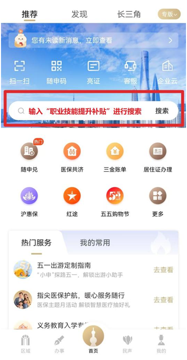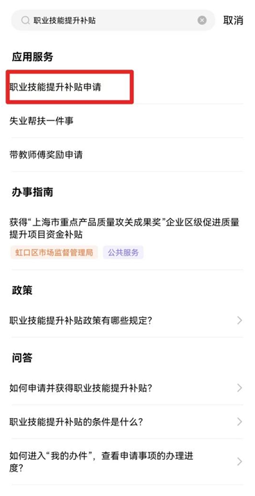 也可在“随申办市民云”APP首页搜索栏中输入“职业技能提升补贴”,在搜索结果中点击“应用服务”中的【职业技能提升补贴申请】事项进入申请界面。