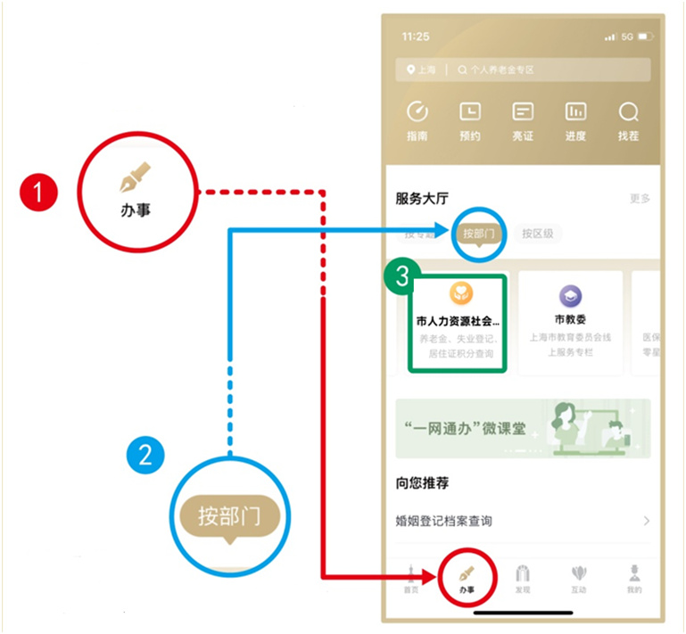 登录“随申办市民云”APP,点击底部【办事】栏目,在服务大厅中点击【按部门】,划动选择【市人力资源社会保障局】。