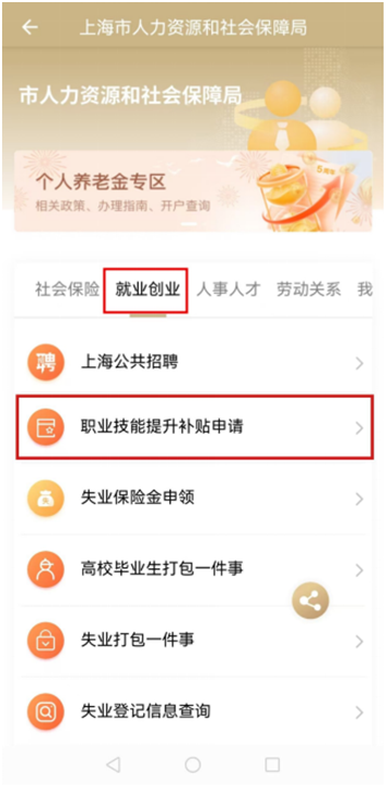 点击【就业创业】,下划找到【职业技能提升补贴申请】事项,点击进入申请界面。