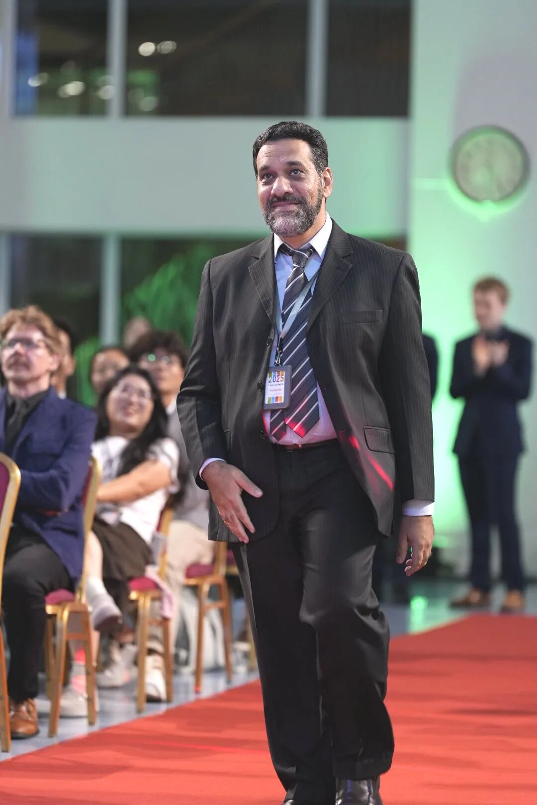 接下来便是酒会最激动人心的时刻——新教师的红毯“亮相”。伴随着大屏幕上播放的风采展示视频,新教师们依次走上红毯。
