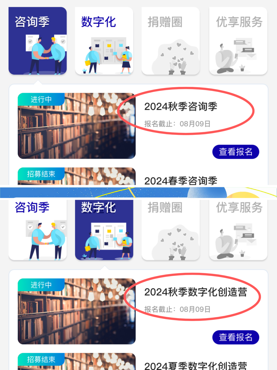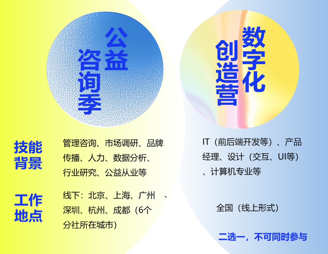 请注意,公益咨询季与数字化创造营二选一报名 ,不接受同时申请。