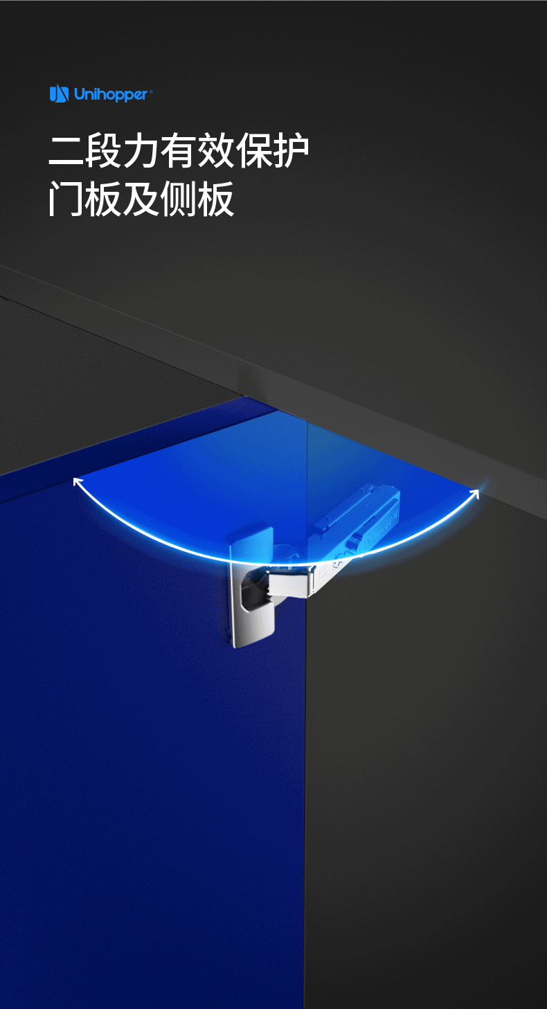 缓冲时间五档可调,适配不同场景,小角度10°触发缓冲,防止柜门撞击柜体的同时还防止夹手,家居安全性提升。二段力开启结构,防撞静音,有效延长家具的使用寿命。优越的抗盐雾腐蚀能力,完美适配卫浴需求。