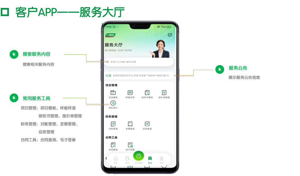 亲爱的合作伙伴,三棵树搭建的“客户协同平台”,集多种功能于一体,让业务办理、信息获取和个性化服务更加集中便捷。
