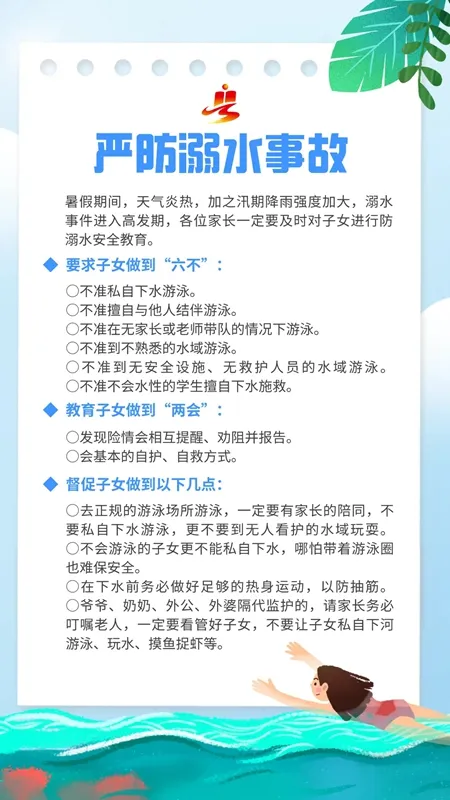 尊敬的各位家长,为了您的孩子能度过一个安全、快乐的暑假,防止溺水事件发生,诚恳希望各位家长积极配合学校的要求,做好以下安全教育工作。