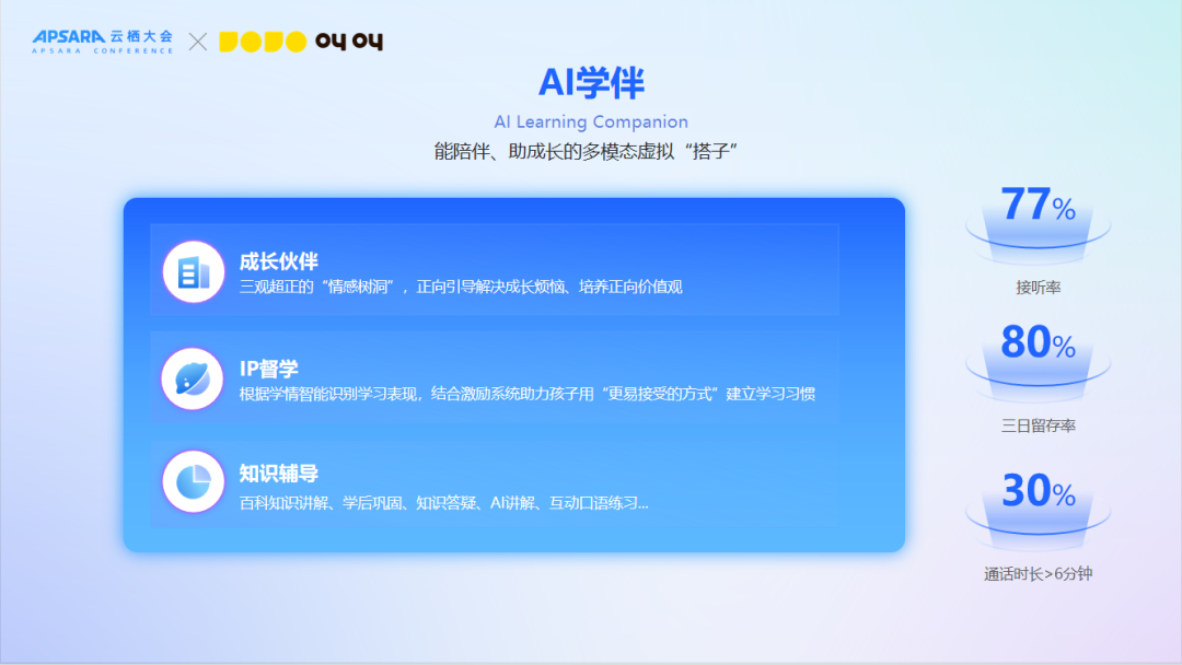 9月25日,在云栖大会“AI Agent定义未来生活”分论坛上,叫叫CTO彭首長带来了《AI叫叫让孩子更爱学习》的主题演讲,不仅聊了和阿里云的合作渊源,还揭秘了叫叫AI已经落地的四大核心场景,每一个都超有料!