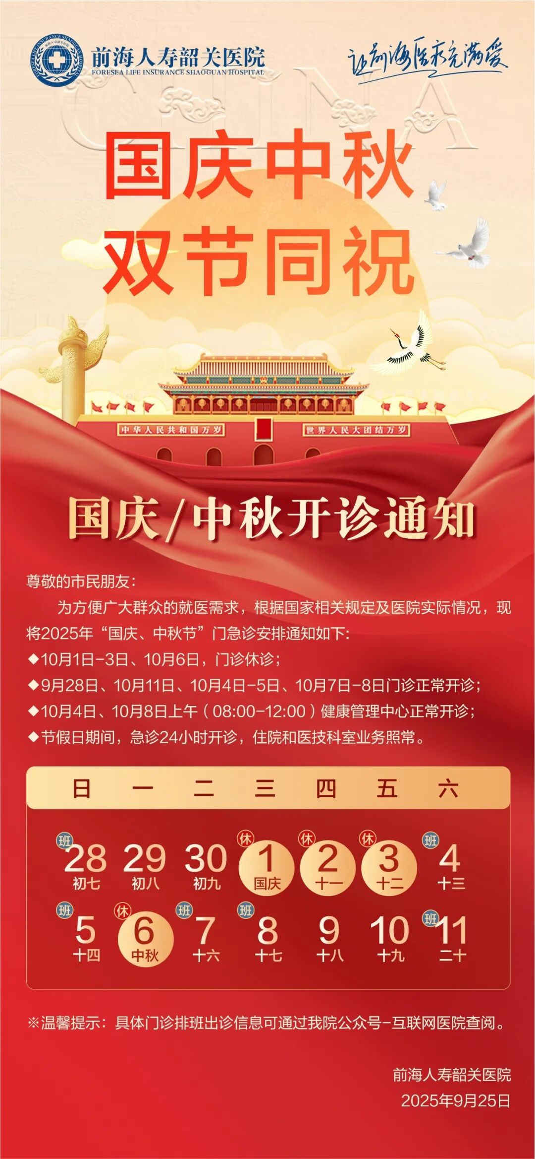 重要通知 | 前海人寿韶关医院2025年国庆中秋双节假期门急诊安排