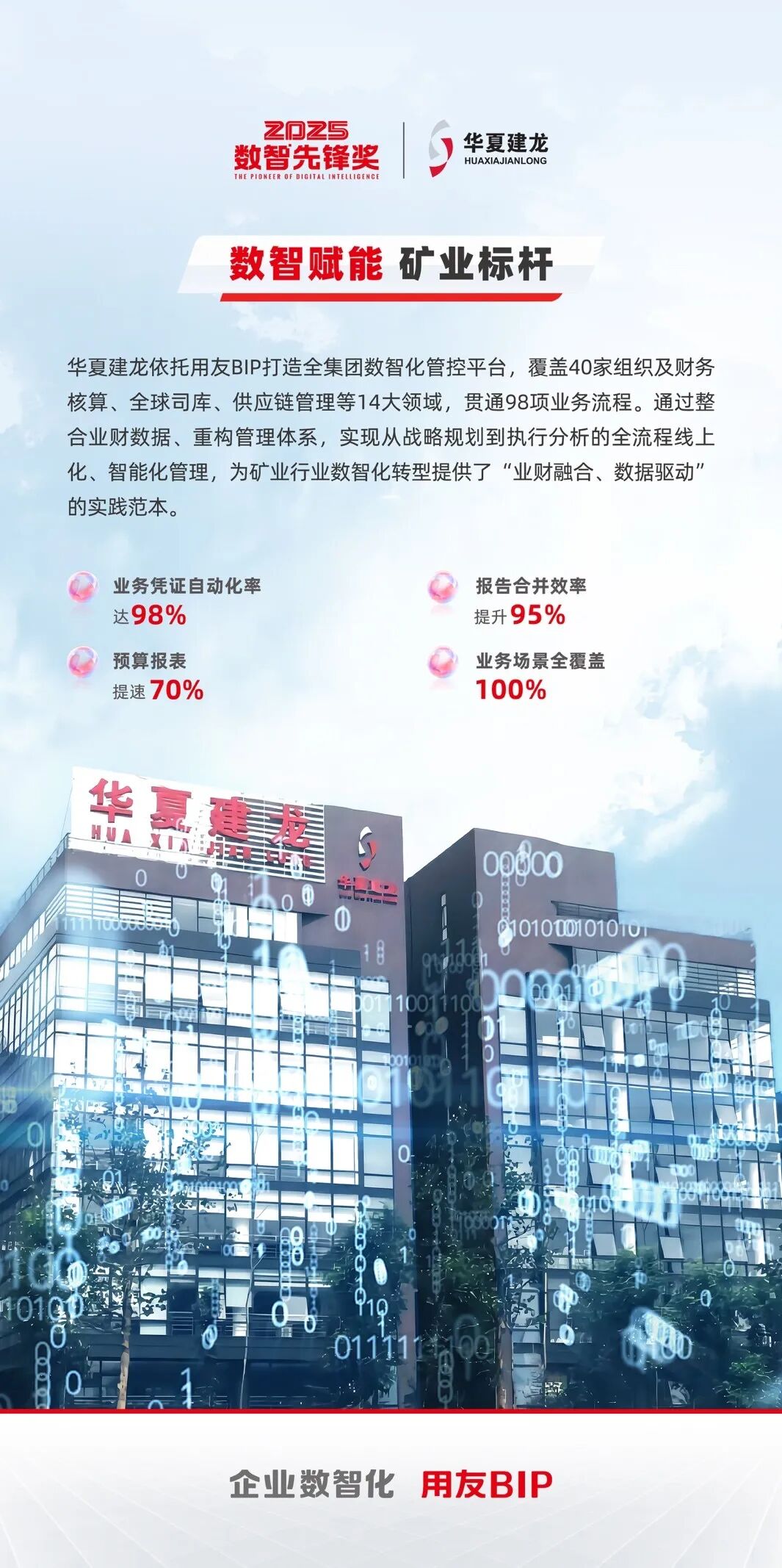 近日,华夏建龙凭借基于用友BIP构建的全集团数智化管控平台,成功斩获 “2025 数智先锋奖”综合示范类企业荣誉,成为矿业行业数智化转型的典范。这一荣誉是对华夏建龙数智化成果的高度认可,同时也标志着用友BIP在重资产行业数智化转型中的深度实践再获突破。