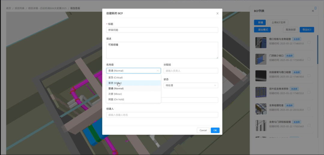 基于海量IFC模型合模,多专业可以协同评审并发现设计或施工问题。这些问题可以在系统上快速生成BCF标准格式的协同文件,并被发送到相关的责任方。在收到消息后,这些相关人员各自在端侧CAD软件中进行问题确认和修复,然后更新提交到CDE中。