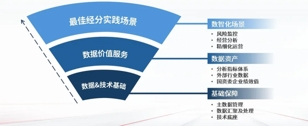 第三层是数智化场景构建,基于前两层的数据基础,搭建了经营管理、风险监控等数智化应用场景,助力集团公司实现更深层次的管理洞察,并为采购效率提升、生产过程监控、精准营销等关键业务领域提供了精细化的运营支持。
