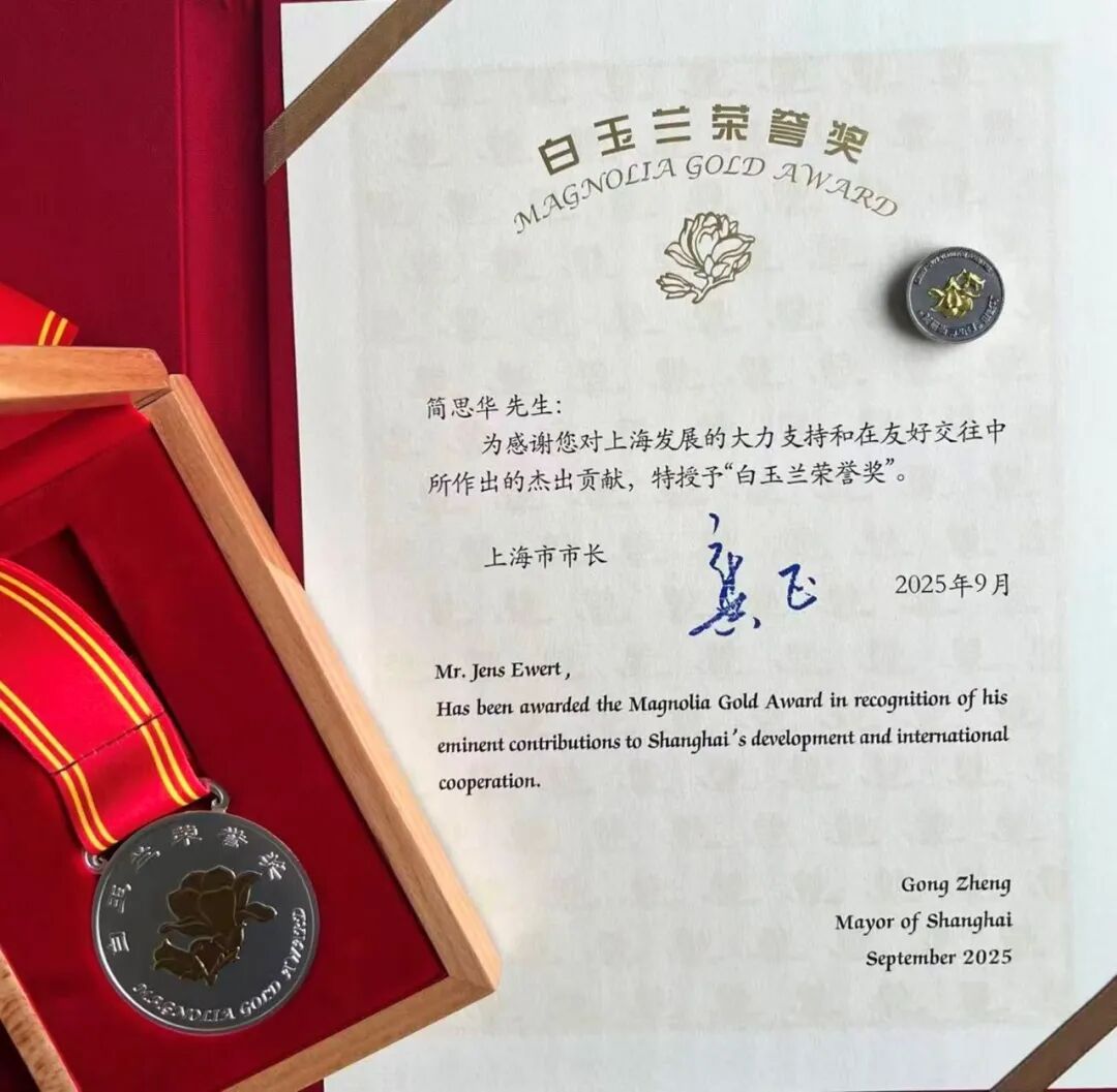 9月29日,2025年上海市“白玉兰荣誉奖”名单正式揭晓,上海市市长龚正为获奖者颁授证章证书。德勤亚太副主席、德勤中国跨国企业客户服务资深合伙人简思华(Jens Ewert)获此殊荣,这是他在2021年荣获上海市“白玉兰纪念奖”之后,又经过四年孜孜不缀的进取和实干,获得的一项更高荣誉。