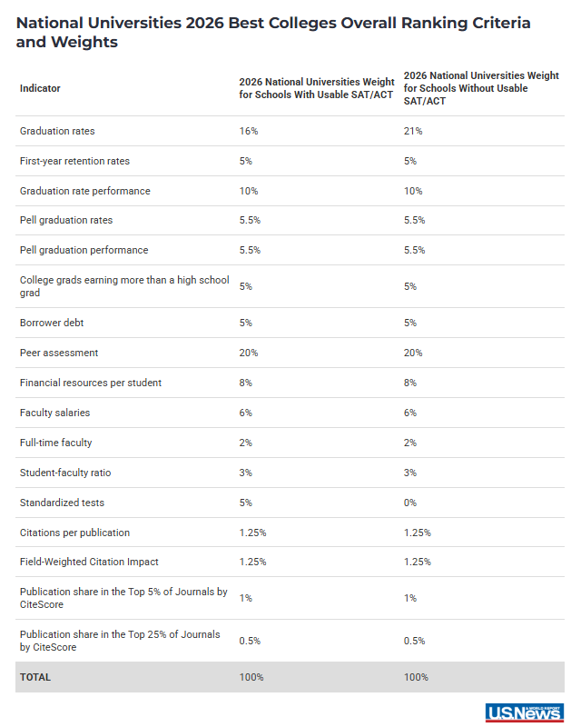 今年U.S. News的排名指标的权重并未调整,和去年一样删除了第一代大学生毕业率与毕业表现,佩尔助学金学生的毕业率和毕业表现从去年的3%提升到5.5%。