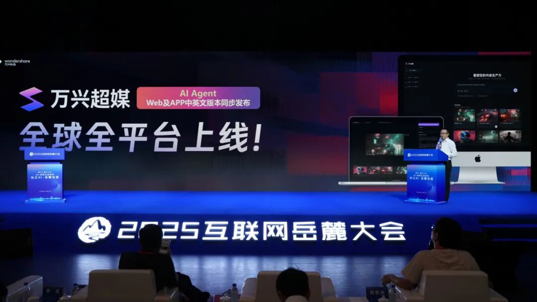 此次演讲,吴总重磅宣布万兴天幕2.0原生应用矩阵全新升级,旗下全链路AI音视频创意智能体万兴超媒Agent Web及App中英文版本在全球全平台正式同步上线,加速推进数字创意软件从单点工具向集成化、自动化、智能体化的综合性解决方案迈进。