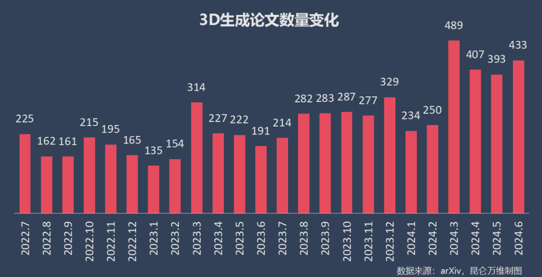 自2023年年底以来,一大批AI 3D模型生成相关技术取得突破,Meta、Adobe、Stability AI,以及VAST(Tripo AI)、sudo AI、Meshy AI、Rodin等海内外玩家动作频频。今年3月以来,arXiv上的3D生成(3D Generation)论文数量更是从200+篇/月飙升至400+篇/月,几乎飙升100%——这背后是3D模型多项核心技术取得突破,大量新兴研究涌现。