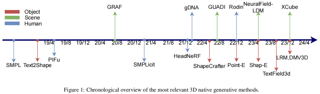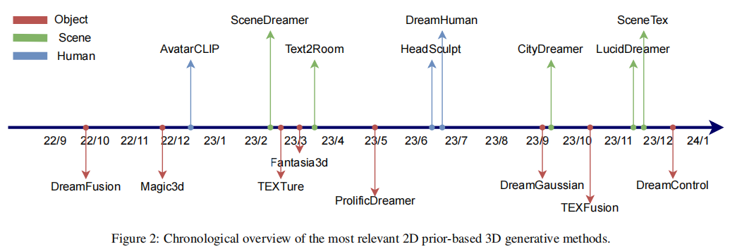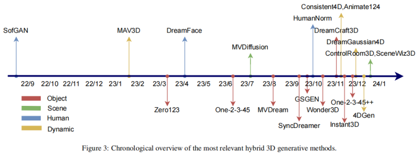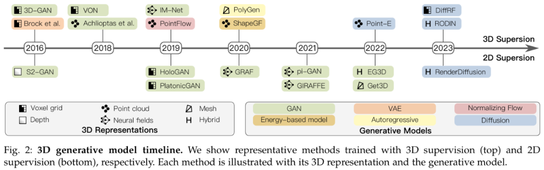 (3D生成模型技术发展路线,数据截止至2023年8月;来自论文《3D Generative Models: A Survey》)