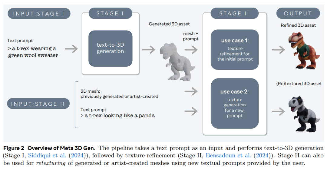 目前,3D大模型业内最新“新鲜”的研究成果来自Meta。2024年6月25日,Meta发布了其最新3D大模型研究——Meta 3D Gen。这是一款文生3D(text-to-3D)大模型,其能够在数十秒(<1分钟)内生成几何形状准确、纹理材质优秀的3D模型。准确来说,Meta 3DGen是一套组合模型,其几何形状与贴图纹理是两个步骤(2 Stages),分别由Meta 3D AssetGen、Meta 3D TextureGen两个模型生成。(Meta 3D Gen生成流程,来自论文《Meta 3D Gen》)这一技术路径将3D几何生成与3D纹理贴图作为两个步骤分别处理,其优势在于几何形状质量更好,而缺点在于会影响模型生成速度与几何纹理一致性。目前,业内也有不少3D大模型方案选择1 Stage一步到位的端到端生成方案,几何与纹理同步输出生成,这一技术路径的优势在于速度与纹理效果,但缺点在于几何形状质量会受到纹理影响——如一张带有波点图案的水平桌面,可能会被3D模型识别为凹凸不平。03.
