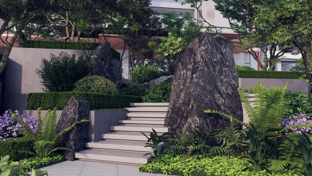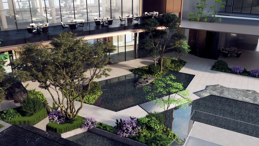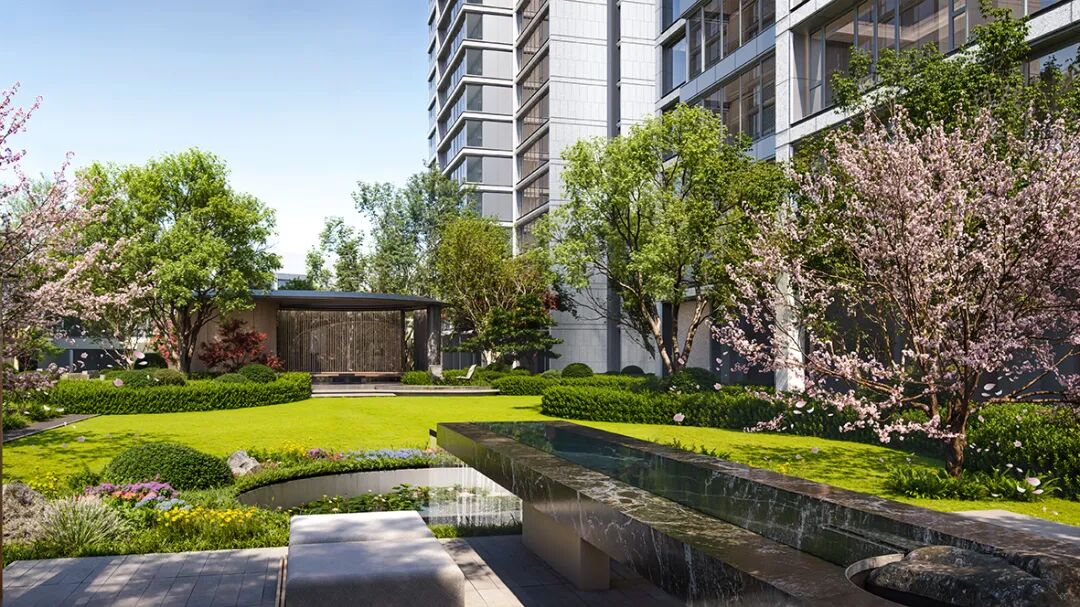 光谷壹号院基于地块天然高差,创新借鉴苏州拥翠山庄的意境营造、美国波特兰凯勒喷泉公园的现代水景手法及纽约泪滴公园的生态理念,打造出武汉罕有的台地式景观体系。