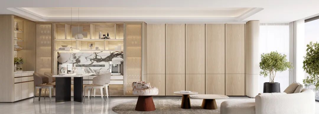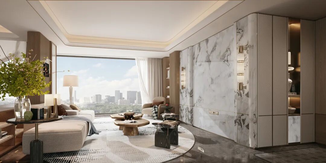空间氛围的营造,源于对材质与细节的极致专注。室内整体精装运用天然石材、进口木皮与金属线条,勾勒出沉稳而富有层次感的现代美学空间。以电视背景墙为例,采用通顶的天然芬迪白石材,并巧妙融入木饰面与金属元素,每一面纹理皆为独一无二的自然艺术品,彰显低调的奢华质感。