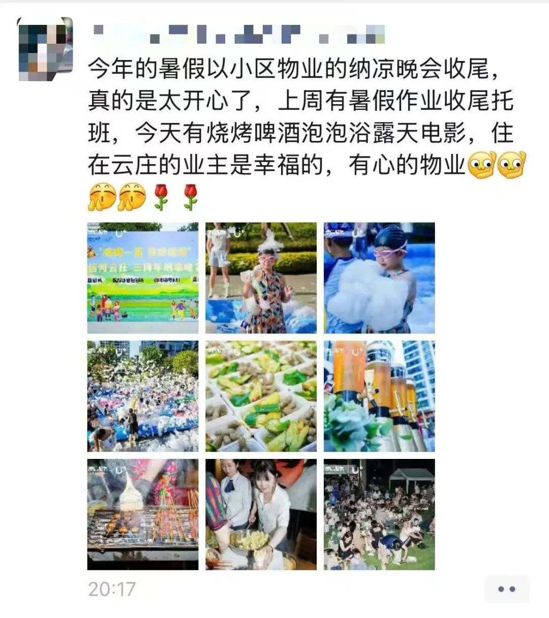 “今年的暑假以小区物业的纳凉晚会收尾真的是太开心了,上周有暑假作业收尾托班,今天有烧烤啤酒泡泡浴露天电影,住在云庄的业主是幸福的,有心的物业。”这是运河云庄业主在纳凉晚会结束后,在朋友圈分享的一段话。当滋滋冒油的烤肉香混着啤酒的清爽,当孩子们在泡泡池里追着光影嬉笑,当露天银幕亮起熟悉的画面……这场为业主量身打造的夏夜派对,不仅收好了暑假的尾巴,更藏着德信服务 3 年来不变的用心。