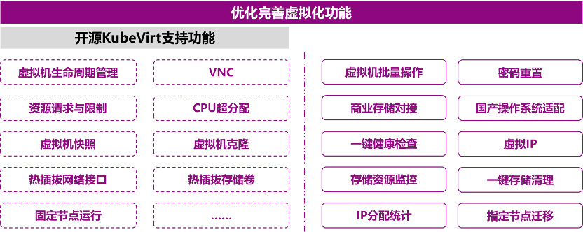 开源KubeVirt以满足虚拟机生命周期管理和基础的快照、网络、存储、VNC访问等需求为主,容器一体机在此基础上进行深度优化,修复密码重置等开源Bug,通过批量操作、健康检查、资源监控等提升运维管理效率,适配商业存储、国产操作系统等满足更高性能、国产化等需求。目前紫光云依旧在对以KubeVirt为基础的虚拟化进行持续优化,保持月度迭代的快速更新。