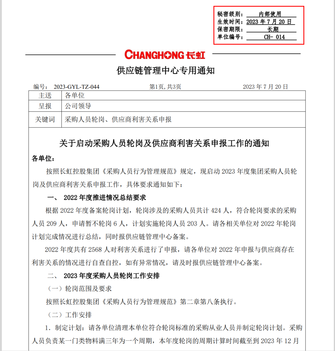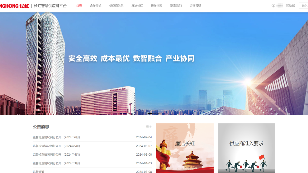 在长虹智慧供应链平台,还专门开辟了“廉洁长虹” 栏目,公开采购监督渠道,接受各界对公司供应链工作的监督。目前,通过推动采购轮岗、强化利害关系申报、开展专题廉洁教育、按月公布渠道监督、实时发布公开寻源信息等,不断促进信息公开。