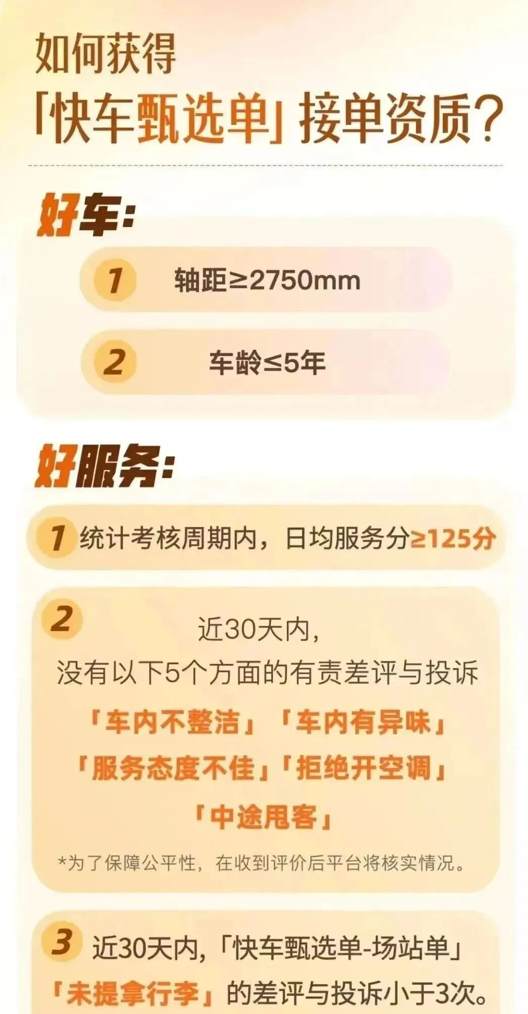 甄选单是滴滴给优质司机的"加薪通道",但"好车好服务"需要持续投入!转发给想接单的兄弟,先检查自己的车和服务分够不够格~