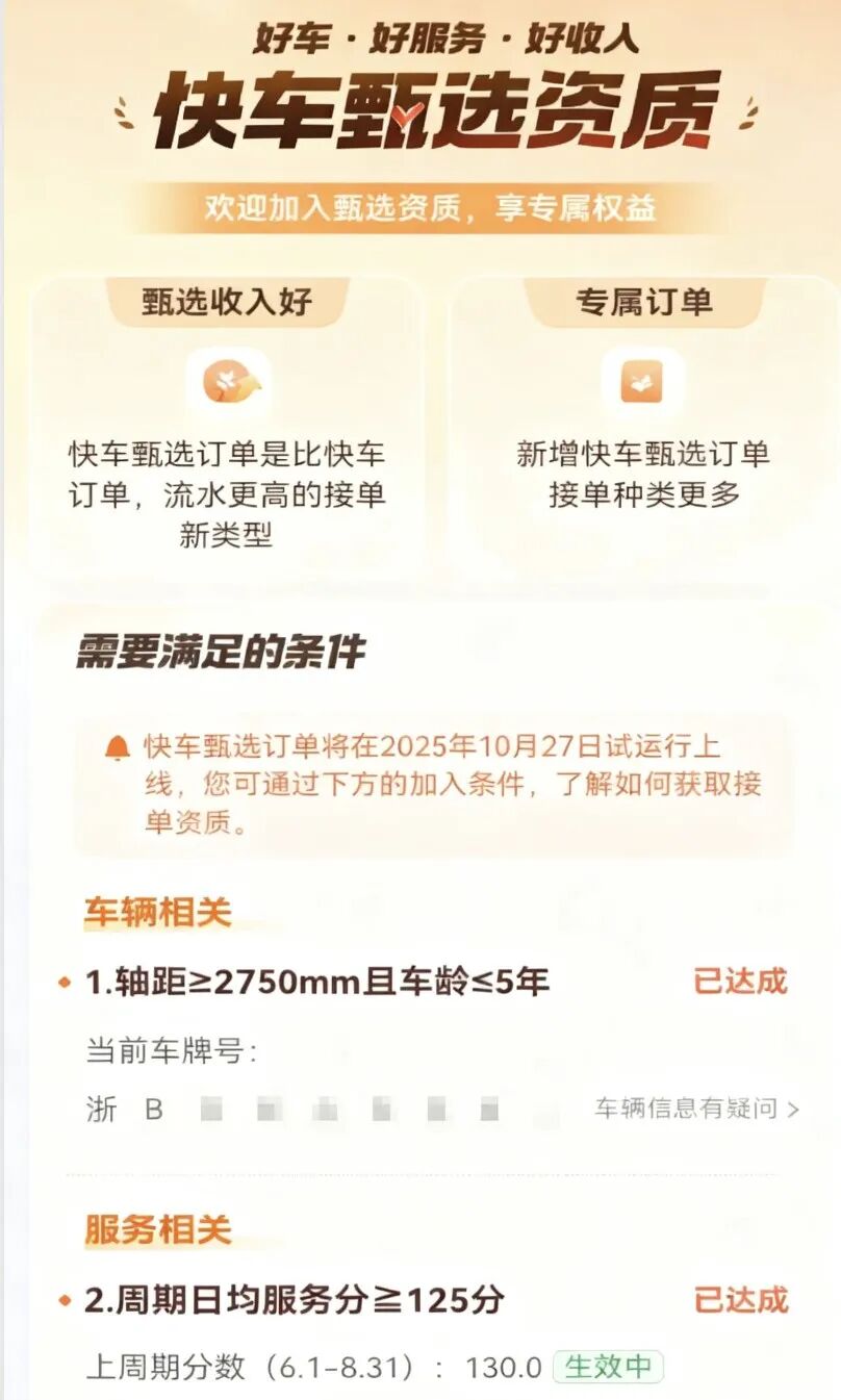 各位滴滴师傅注意啦! 好消息来啦——滴滴"快车甄选单"又要扩张啦!10月27日起,宁波、天津、苏州的司机也能接这类"高价单"了!收入最多涨10%,但想接单得先过这两关