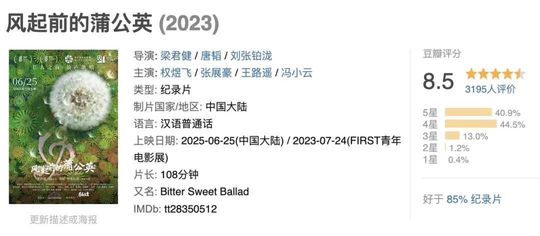 而在角落里,有一部纪录片,票房连百万都没到,却在豆瓣悄悄攒下了 8.5 分的高口碑。