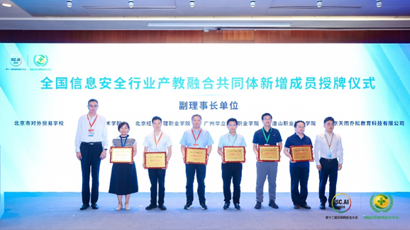 大会发布仪式环节中,北京信息职业技术学院党委书记、院长洪伟,360数字安全集团副总裁卜思南为全国信息安全行业产教融合共同体的6所新增副理事长单位代表和8所新增理事单位代表现场授牌。