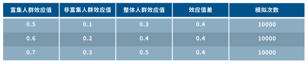 案例1:控制整体人群效应值一致,控制整体人群效应值一致的情况下,标志物高表达受试者和低表达受试者差距越大,进入富集区域的概率越大,且富集区域例的试验成功率越高。