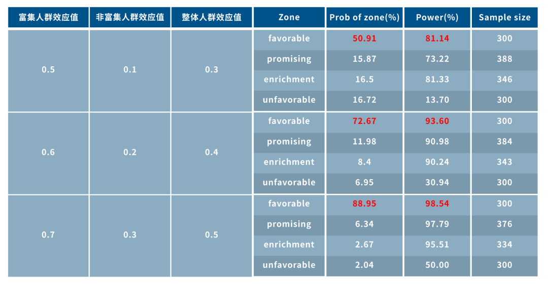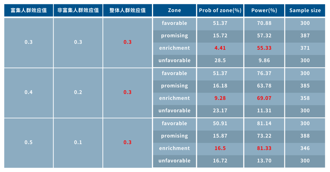 根据模拟结果,可以得出结论:若生物标志物阳性受试者和阴性受试者疗效有明显的差距,且差距并不小,使用适应性富集设计策略,可以提高进入富集区域的概率,从而提高试验成功率;但也应注意,若生物标志物阳性受试者疗效过高,且全人群中阳性受试者比例大,则可能拉高整体疗效,导致认为阴性受试者也会有疗效的结论,这不仅仅是适应性富集设计的风险,任何临床试验都会有这样的风险。