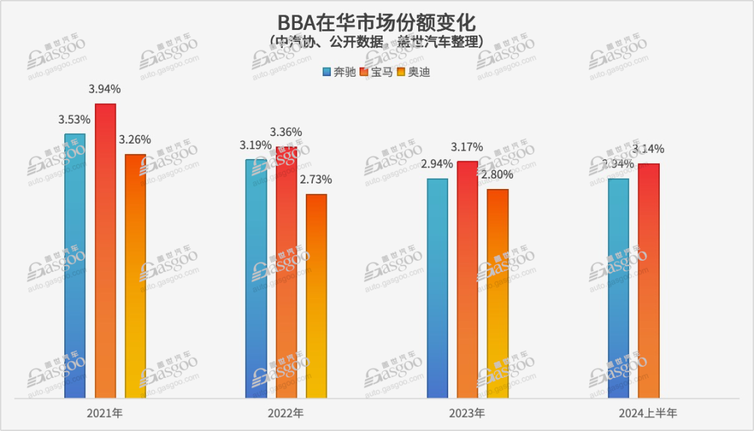 数据显示,BBA近四年在中国市场份额并无显著变化。原本属于雷克萨斯、林肯等豪华品牌丢失的市场份额被造车新势力瓜分。尤其是特斯拉从中受益,在中国豪华车市场的份额从2020年的5%跃升至2024年上半年的22%。