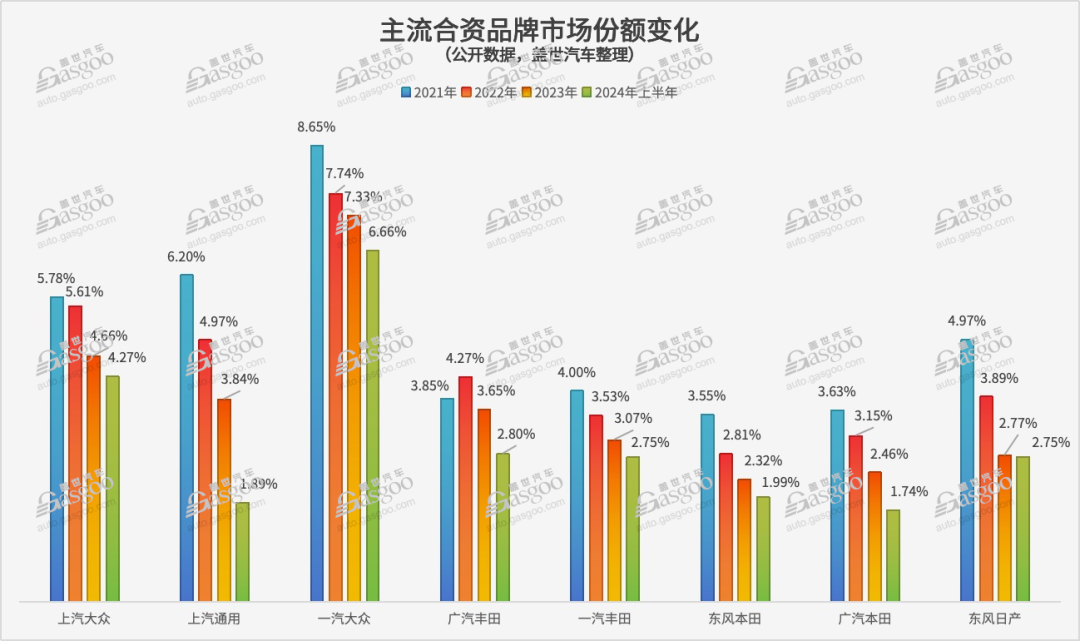 上汽通用、一汽大众、广汽丰田等主流合资品牌均面临市场份额下滑的困境。其中,上汽通用市场份额相较2021年下滑了4个百分点至1.9%。一汽大众市场份额也下滑了2个百分点至6.7%,东风日产同样减少了2个百分点。上汽大众、广汽丰田、一汽丰田等下滑了1个百分点左右。