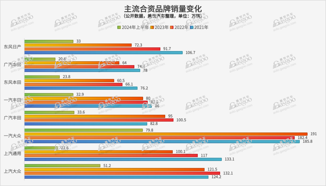 主流合资品牌的处境更为严峻,市场份额从2021年的45.6%降至2024年上半年的29.9%。相比之下,中国品牌份额从41.2%上涨至56.5%,呈现出“合资退自主进”的局面。