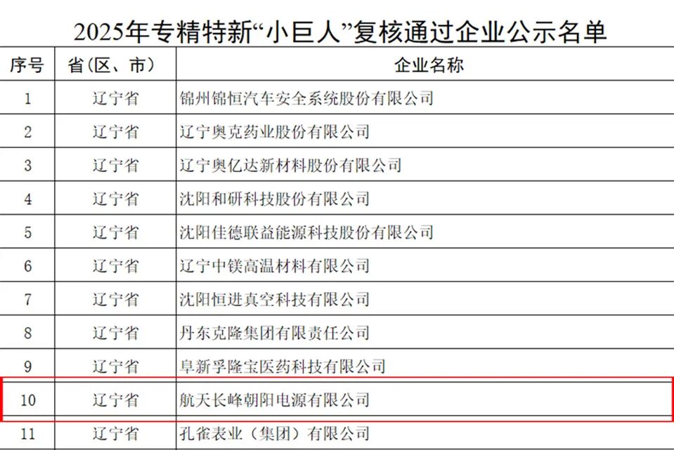 航天朝阳电源通过国家专精特新“小巨人”企业复核