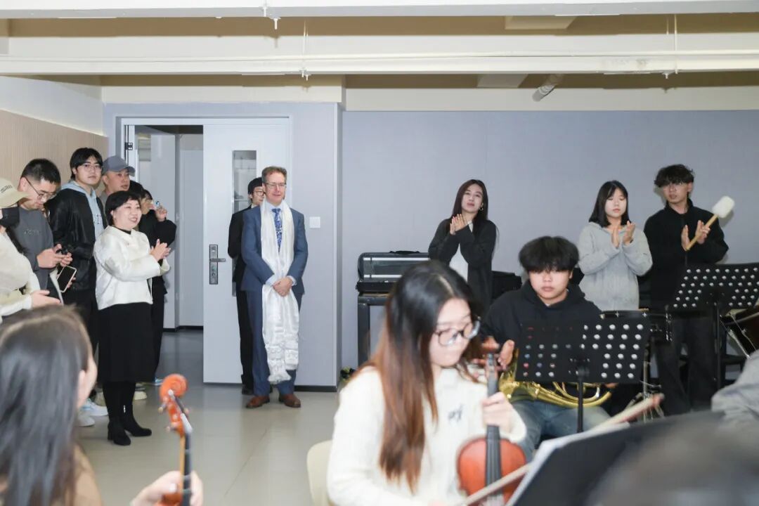 在随后的冷餐交流会上,没有刻板的寒暄,只有音乐与文化的自然流淌。同学们用略带青涩但真挚的语言向教授介绍自己的专业方向:有的钟情钢琴演奏的细腻表达,有的痴迷民族音乐的独特韵律,有的好奇国际乐团的协作模式……卢克·多尔曼教授认真倾听,时而点头微笑,时而分享自己的经历。他鼓励同学们保持对音乐的热爱,勇敢探索不同风格的融合。