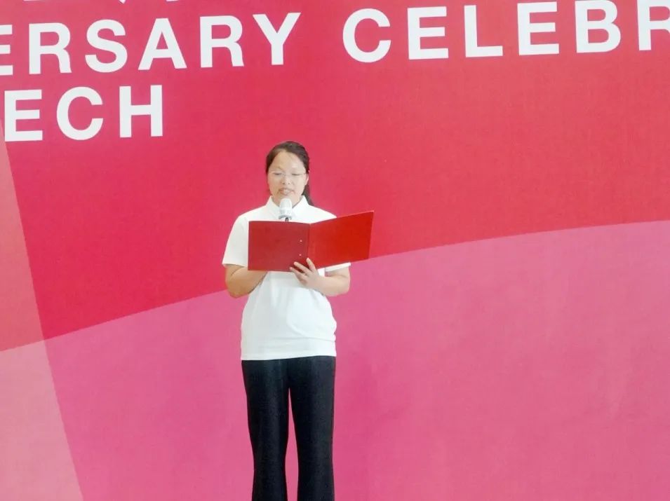 仪式开始由四名忠诚员工代表朗诵《水晶谱·序》。随着他们的深情朗诵,我们仿佛穿越时光,回到了那个充满挑战与希望的起点。千淘万漉虽辛苦,吹尽黄沙始到金,可敬可爱的水晶人,开创了水晶光电从零开始到业界翘楚的光辉历程。